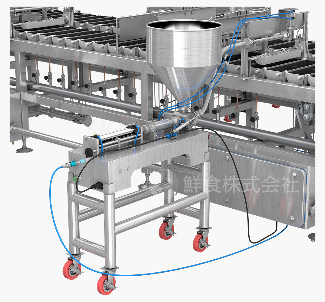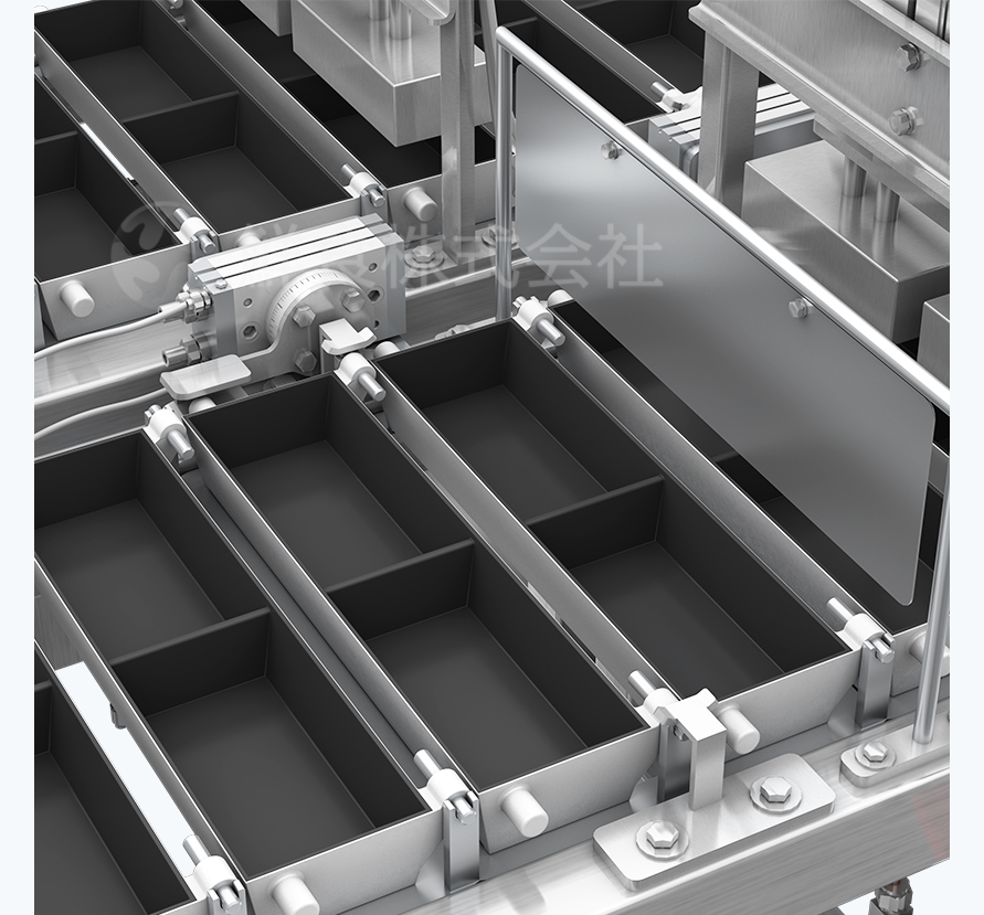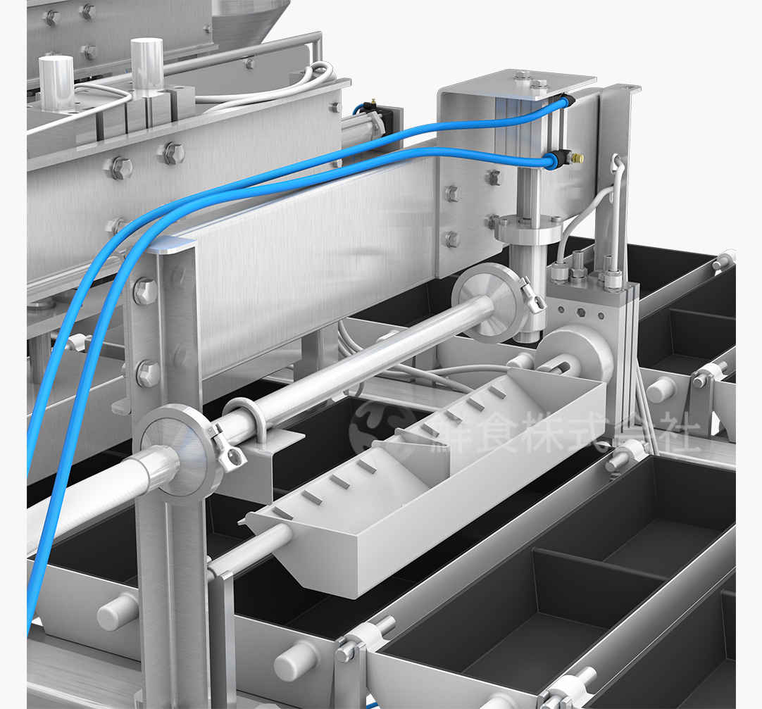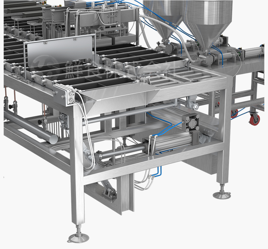 定量灌装系统:由定量灌装机和蛋液倾倒机构组成。定量灌装系统可以把控每一层蛋液重量来调节每一层蛋饼厚度,根据动作周期定时提供蛋液。蛋液倾倒机构在短时间内将蛋液均匀的分布到蛋盒内,确保每一层蛋液都受热均匀。